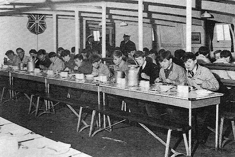 “The first meal you had on arrival on the ship was a mug of coco and two slices of bread and dripping.  I drank the coco but pushed the bread away which was promptly picked up by one of the old boys.  I never ever made that mistake again.”   Des Taff Jenkins summer 1949 m