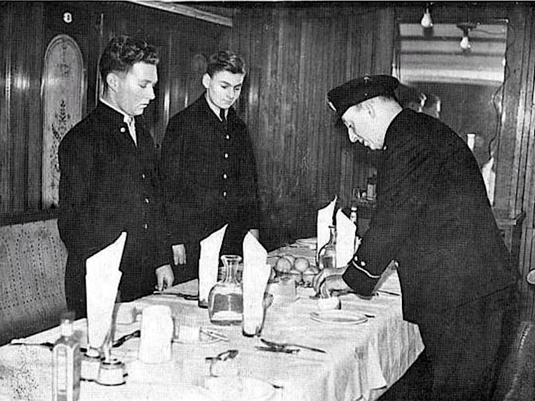Trainee stewards learning how to set table & serve dinner in the Officers' Messroom
