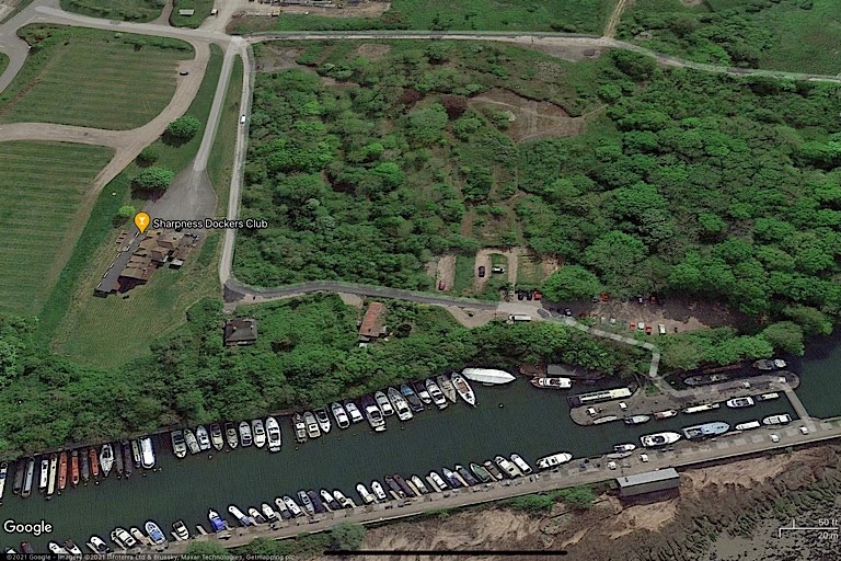 The ship was berthed on the Gloucester & Sharpness Canal at the location of the current Sharpness Marina.  The red brick building which is now a chandlery was a toilet block.