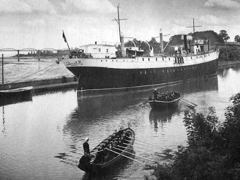 T.S. Vindicatrix moored with the since lost rail bridge in the background
